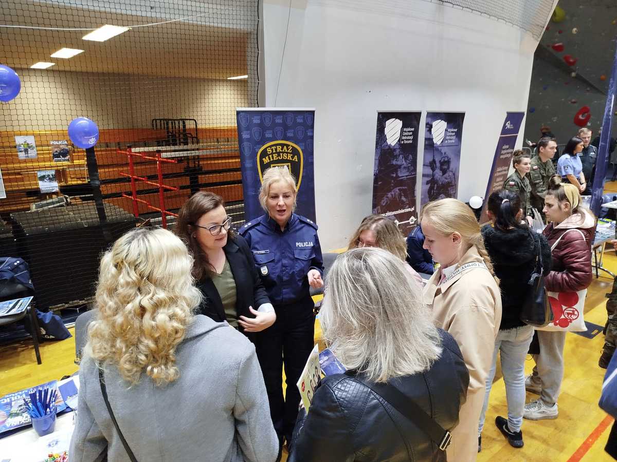 W ramach targów zostało także przygotowane policyjne stanowisko. Funkcjonariusze, którzy na co dzień pełnią służbę w tutejszej komendzie opowiadali zainteresowanym odwiedzającym o podstawowych pionach i rodzajach służby, przedstawiając również zadania, jakie realizują na co dzień funkcjonariusze poszczególnych wydziałów. Mundurowi mówili również o etosie zawodu policjanta, o rocie ślubowania, wartościach i wzorach postępowania oraz zasadach etyki zawodowej, jakimi powinien kierować się kandydat.