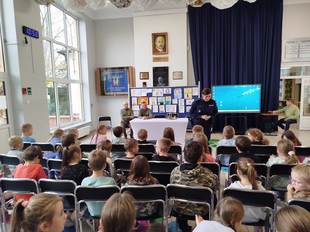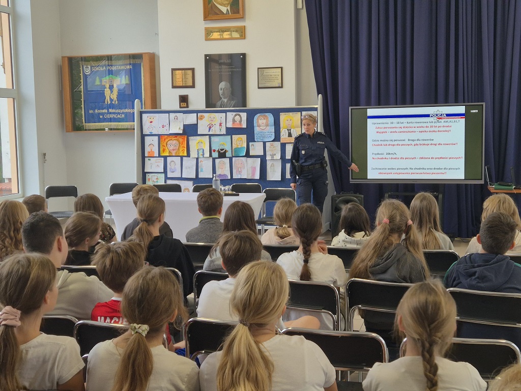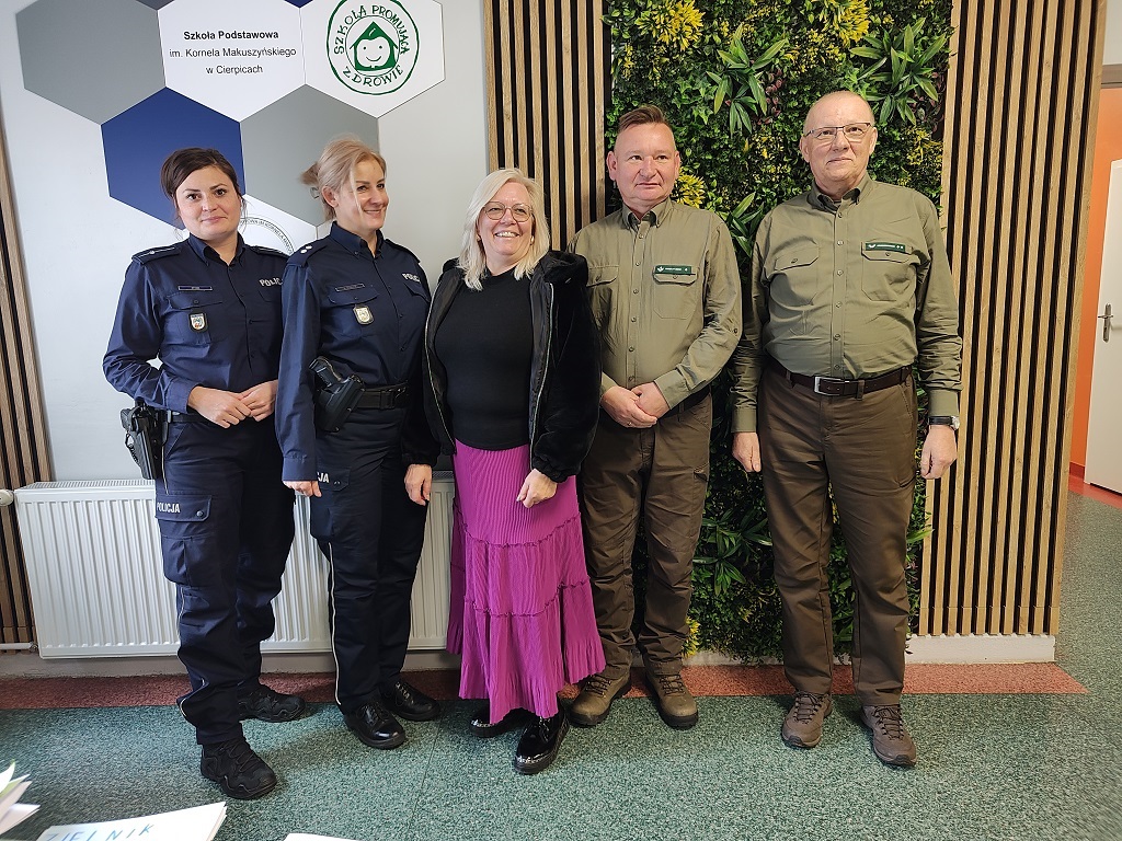 W dniu 27.10.2025 roku policjantki oraz technik z Zespołu ds. Profilaktyki Społecznej Wydziału Prewencji Komendy Miejskiej Policji w Toruniu podkom. Agnieszka Bubień, mł. asp. Adrianna Nadarzewska oraz Michał Kuklewski wspólnie z funkcjonariuszami Służby Leśnej Nadleśnictwa Cierpiszewo z inżynierem nadzoru Panem Arkadiuszem Kaczmarczyk i strażnikiem leśnym Panem Markiem Chełminiak odwiedzili uczniów Szkoły Podstawowej w Cierpicach. Podczas spotkania z uczniami klas IV-VIII policjantki szczegółowo omówiły zasady bezpiecznego poruszania się nowoczesnymi środkami transportu w szczególności hulajnogami elektrycznymi. Uczniowie dowiedzieli się, kto może korzystać z tego środka transportu, w jakich prędkościach można się poruszać, w jakich miejscach wolno jeździć oraz dlaczego tak ważne jest zakładanie kasku i elementów odblaskowych. Funkcjonariuszki podkreśliły, że hulajnoga to nie zabawka, lecz pojazd za którego użytkowanie odpowiadamy tak samo, jak za jazdę na rowerze. Przypomniały również, że obowiązują określone przepisy, a ich nieprzestrzeganie może prowadzić do groźnych wypadków. Z dziećmi klas I-III policjantki rozmawiały o bezpiecznym zachowaniu na drodze w domu i szkole, a także o tym jak reagować w sytuacjach zagrożenia. Uczniowie utrwalili znajomość numerów alarmowych i dowiedzieli się jak poprawnie wezwać pomoc.