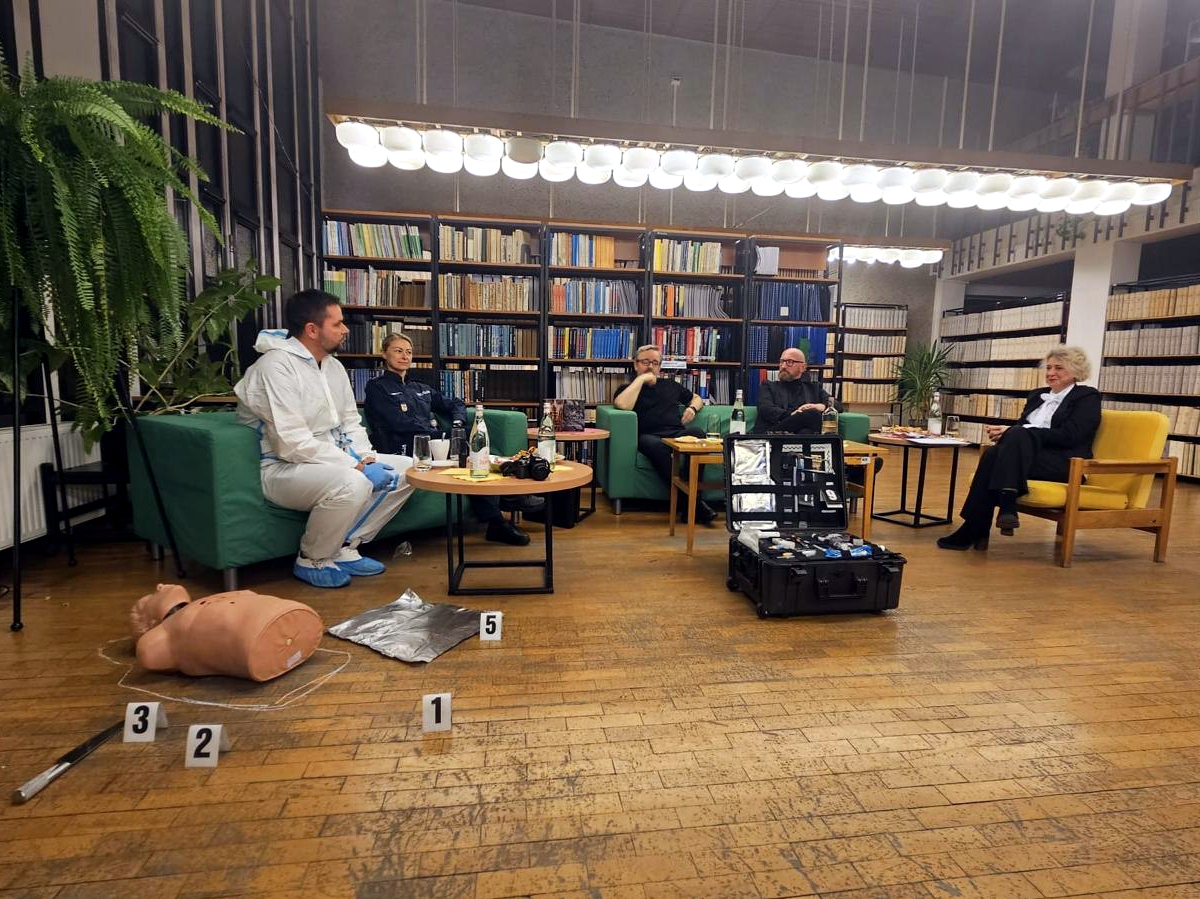 „Fantastyczna kryminalistyka. Od świata zagadek po crime story” to tytuł spotkania, które odbyło się wczoraj (28.10.2025) w bibliotece Wydziału Chemii Uniwersytetu Mikołaja Kopernika w Toruniu. Inicjatorem wydarzenia była Pani Aleksandra Kruszyńska kustosz biblioteki Wydziału Chemii Uniwersytetu Mikołaja Kopernika w Toruniu. Wśród zaproszonych gości byli dr Andrzej Wolan Prodziekan ds. Studenckich i Kształcenia, Robert Małecki autor powieści kryminalnych, policjanci z toruńskiej komendy kom. Małgorzata Olewińska oraz asp. Sławomir Kardyś.