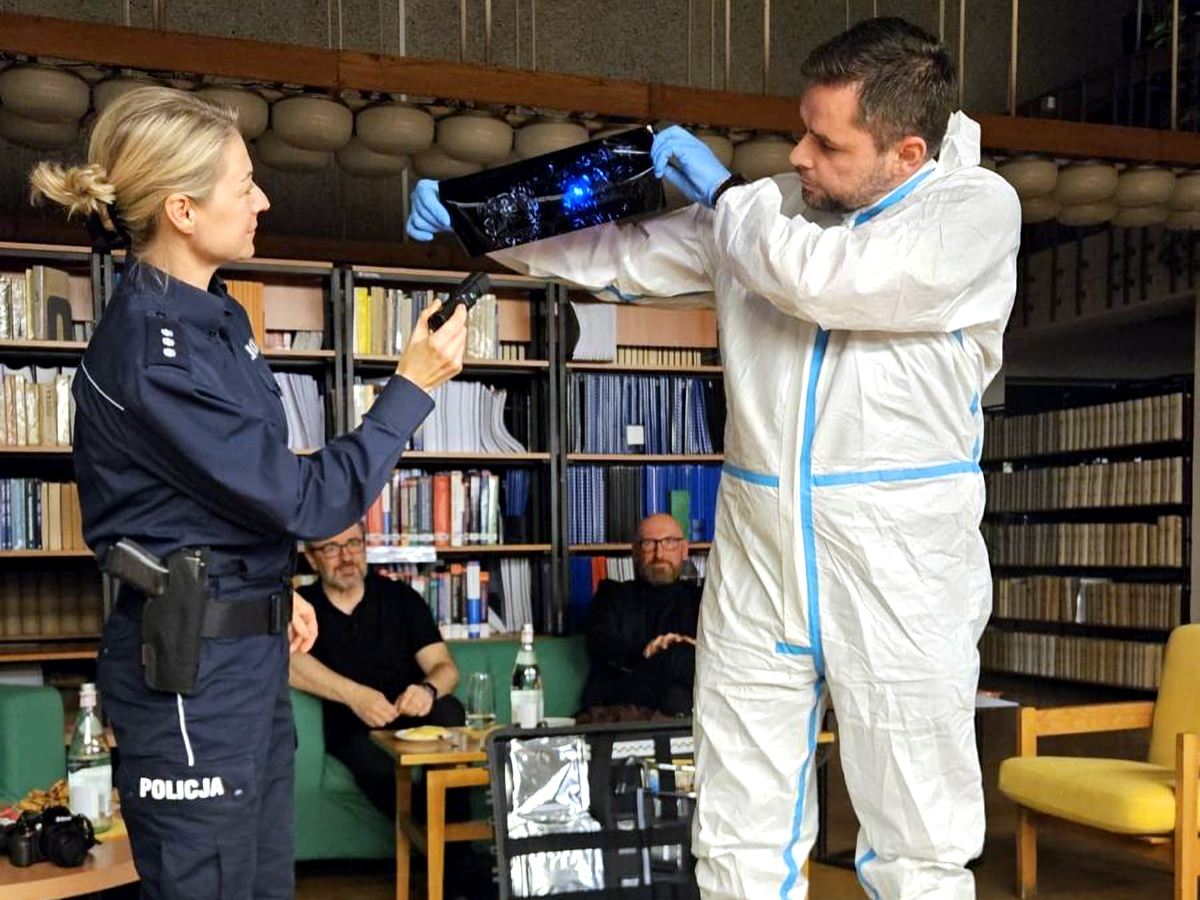 Podczas tego wydarzenia uczestnicy mieli również wyjątkową okazję zapoznać się z policyjną pracą od kulis. Słuchaczom została przybliżona praca służb mundurowych na miejscu zdarzenia, w szczególności technika kryminalistyki, który odgrywa znaczącą rolę. Funkcjonariusz zaprezentował metody zabezpieczania śladów podczas upozorowanego miejsca zdarzenia. Opowiedział o metodach stosowanych przy ujawnianiu m.in. śladów biologicznych, chemicznych czy traseologicznych. Duże zainteresowanie wzbudziły zagadnienia związane z techniką identyfikacji osób na podstawie odbitek linii papilarnych. Uczestnicy mogli nie tylko dowiedzieć się, w jaki sposób pobiera się odciski palców, ale także zobaczyć sprzęt wykorzystywany do ich ujawniania i zabezpieczania.