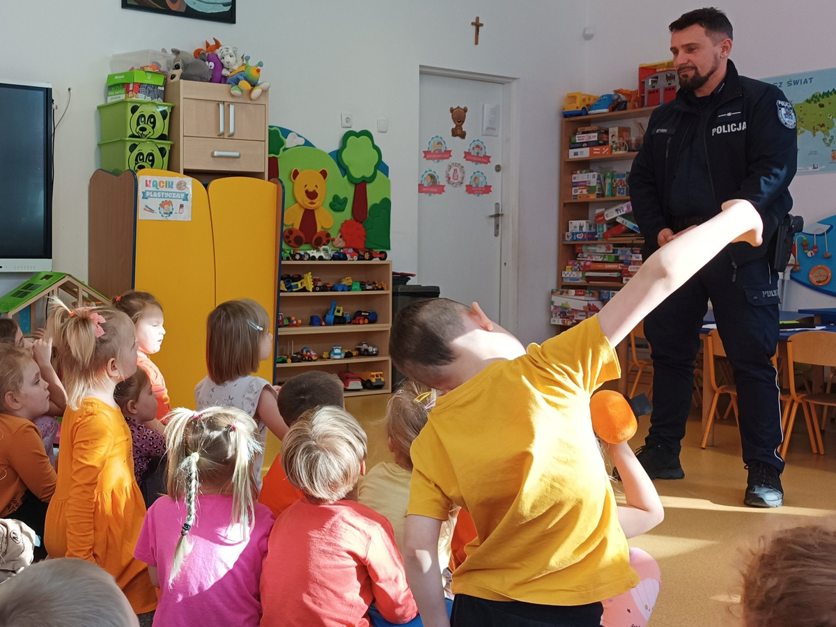 Przedszkolaki miały okazję zadać policjantowi wiele pytań dotyczących jego pracy i codziennych obowiązków. Funkcjonariusz chętnie opowiadał o swojej służbie, prezentując elementy umundurowania i wyposażenia, co wzbudziło ogromne zainteresowanie najmłodszych.
