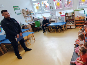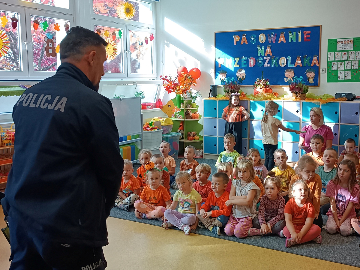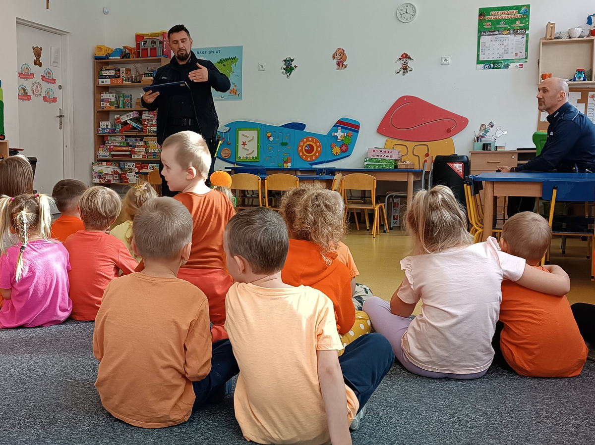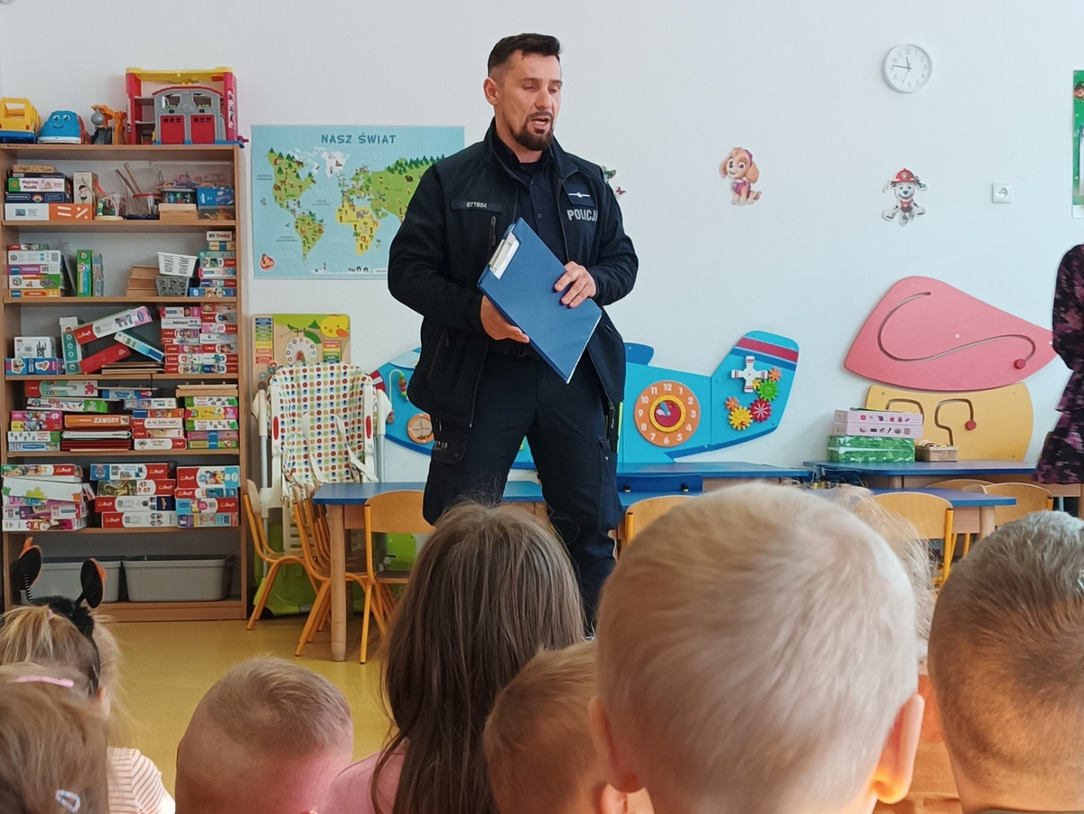 Ważnym częścią spotkania był także temat kontaktów z nieznajomymi. Policjant wytłumaczył dzieciom, że nie wolno rozmawiać z obcymi, przyjmować od nich prezentów, słodyczy ani wsiadać do nieznanych pojazdów. Wyjaśnił, jak reagować i kogo poprosić o pomocy w sytuacjach zagrożenia. Uczulał również dzieci, by zawsze zgłaszały dorosłym, gdy coś je zaniepokoi. Funkcjonariusz podkreślił też, jak ważna jest wzajemna pomoc i życzliwość w grupie.
