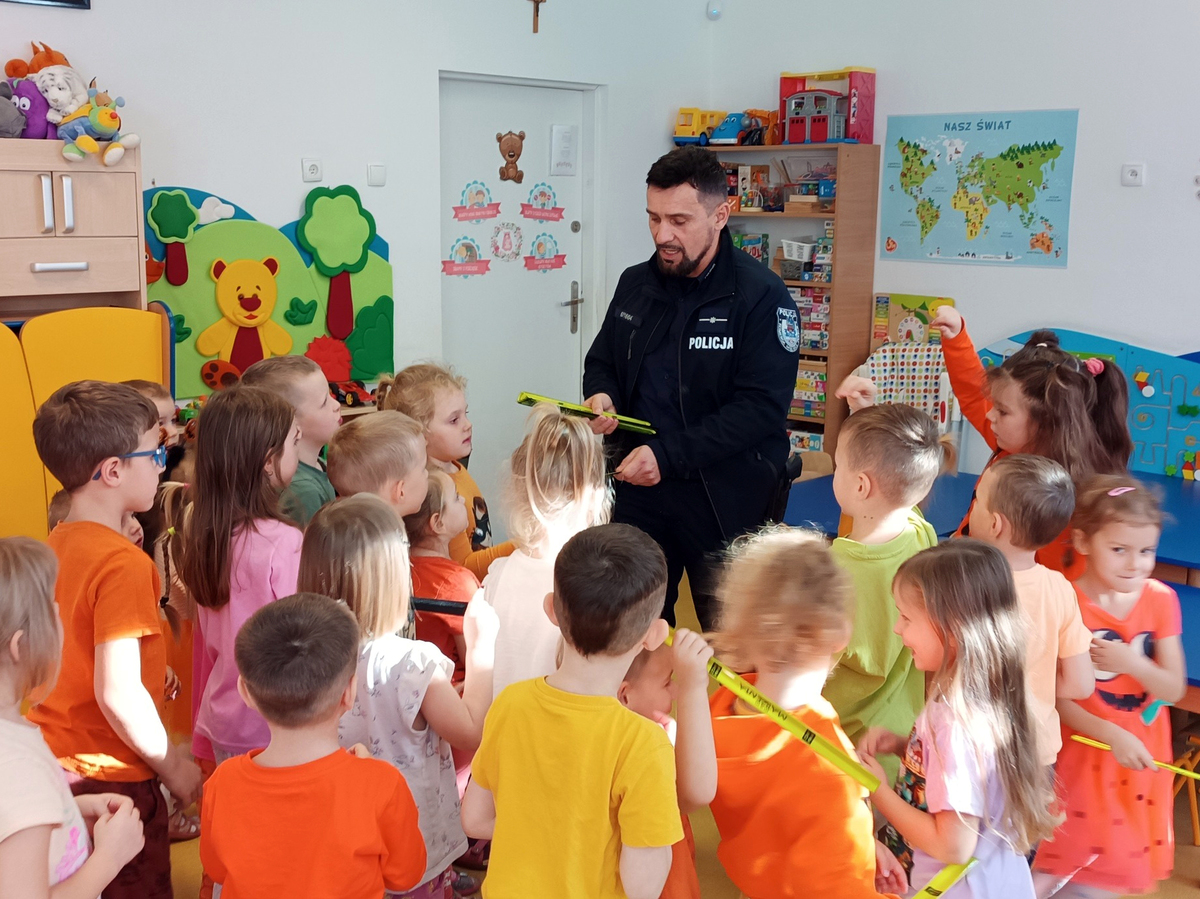 Na zakończenie spotkania każde dziecko otrzymało od policjanta odblask, który ma przypominać o tym, jak ważna jest widoczność po zmroku.