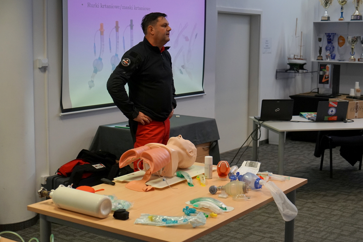 Następnie Wiceprezes Zarządu Głównego WOPR Pan Maciej Banachowski przypomniał w jaki sposób efektywnie udrażniać drogi oddechowe przy udzielaniu kwalifikowanej pierwszej, a także poprowadził warsztaty praktyczne w tym zakresie.