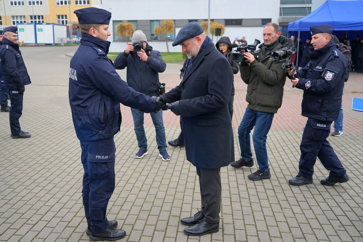 Marszałek Województwa Kujawsko-Pomorskiego Pan Piotr Całbecki, reprezentujący instytucję zarządzającą programem „Fundusze Europejskie dla Kujaw i Pomorza 2021-2027”, symbolicznie przekazał Pierwszemu Zastępcy Komendanta Wojewódzkiego Policji w Bydgoszczy inspektorowi Marcinowi Woźniakowi, zakupiony sprzęt.