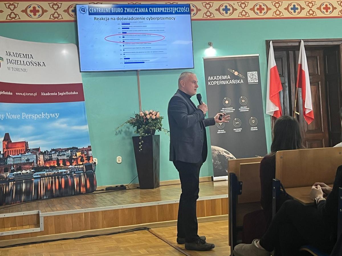 W piątek i sobotę (21-22.11.2025), policjantki z Wydziału Prewencji Komendy Miejskiej Policji w Toruniu oraz funkcjonariusz Centralnego Biura Zwalczania Cyberprzestępczości wzięli udział w konferencji naukowej pn. „Jak zerwać cyfrową smycz” - VI Ogólnopolski Kongres Pedagogiki Chrześcijańskiej. Dwudniowe spotkanie w siedzibie Akademii Jagiellońskiej w Toruniu zgromadziło ekspertów i praktyków zajmujących się bezpieczeństwem w sieci i stworzyło przestrzeń do wymiany doświadczeń.