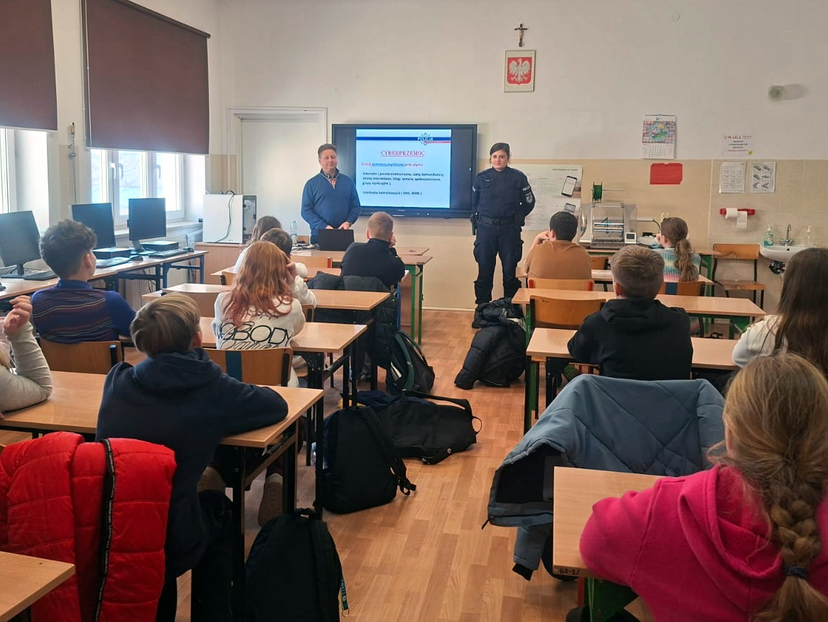 Młodsza aspirant Adrianna Nadarzewska omówiła podstawowe zasady bezpiecznego korzystania z Internetu i problematyce cyberprzemocy. Opowiedziała o różnych jej formach. Uczniowie dowiedzieli się, że choć działania te odbywają się w przestrzeni wirtualnej, ich skutki są jak najbardziej realne i potrafią głęboko ranić. Funkcjonariuszka zachęcała, aby zawsze reagować, gdy jest się świadkiem krzywdzenia innych i zgłaszać takie sytuacje nauczycielowi, rodzicom lub policjantom.