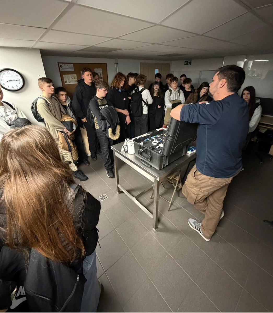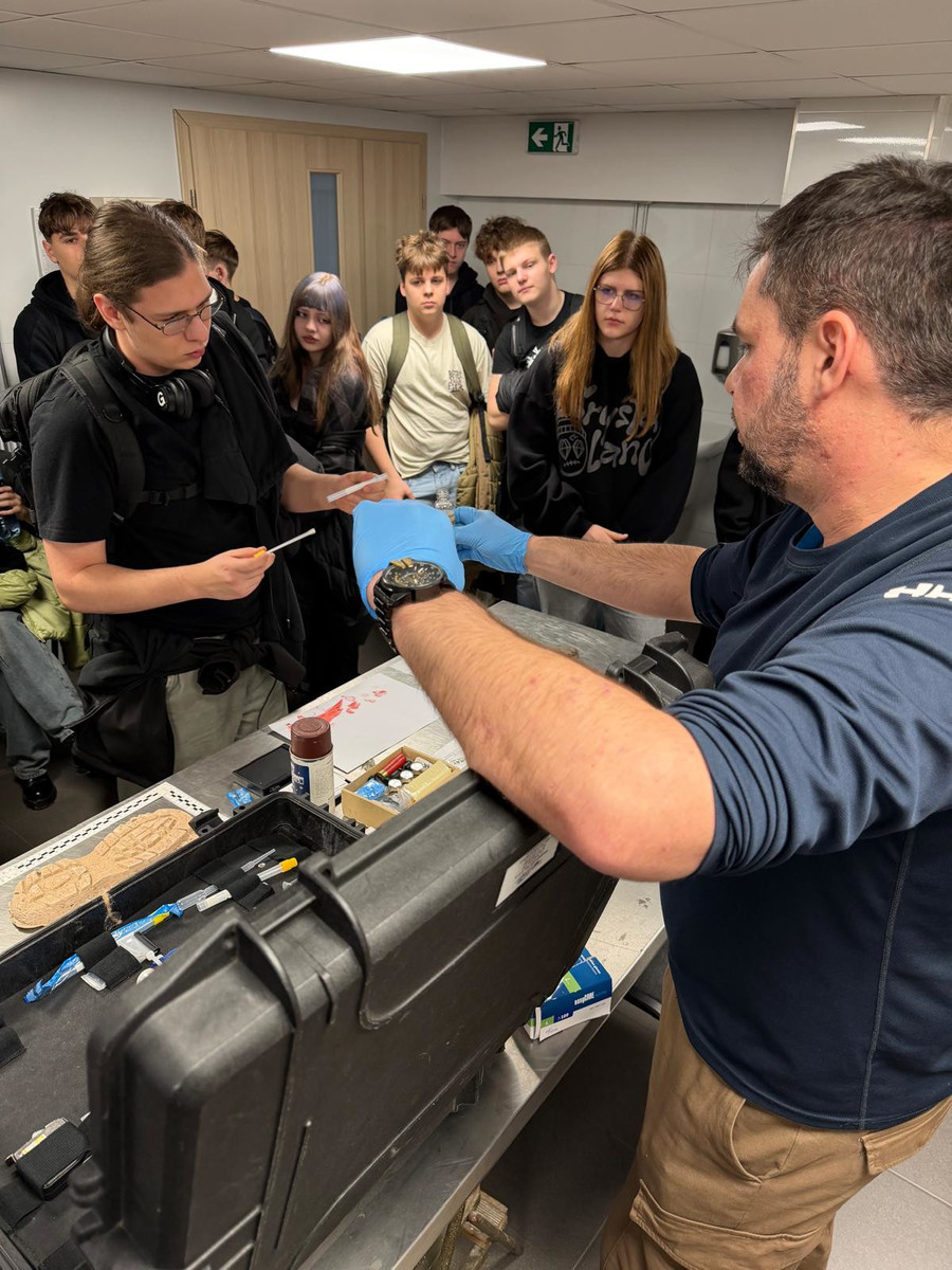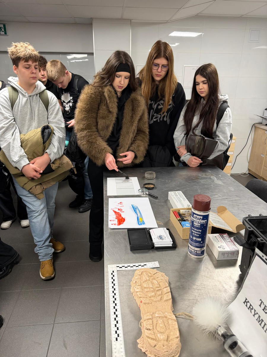 Największe zaciekawienie podczas spotkania wzbudził technik kryminalistyki. Policjant opowiedział o zabezpieczaniu śladów oraz zaprezentował narzędzia i metody stosowane m.in. podczas wykrywania i zabezpieczania odcisków palców czy obuwia. Słuchacze mieli możliwość zobaczyć, jak działa specjalistyczna „kabina” do wykonywania zdjęć osób podejrzanych, jak wykonuje się dokumentację fotograficzną oraz, jak wygląda analiza zabezpieczonych materiałów. Uczniowie dowiedzieli się również jakie znaczenie mają szczegóły, precyzja i jak ważna jest dokładność w wykonywaniu policyjnych zadań.