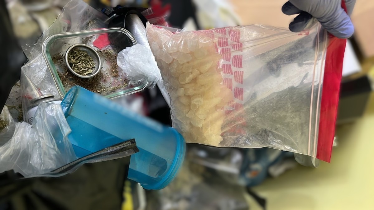 Wstępne policyjne testy wykazały, że była to: marihuana, amfetamina, mefedron, 2C-B, morfina. Kryminalni odkryli także kilogramy i litry innych substancji, które trafiły do dalszej analizy. Ponadto w mieszkaniach znaleźli wagi elektroniczne, worki, zgrzewarki do folii, maski przeciwpyłowe, liczarkę banknotów oraz gotówkę.