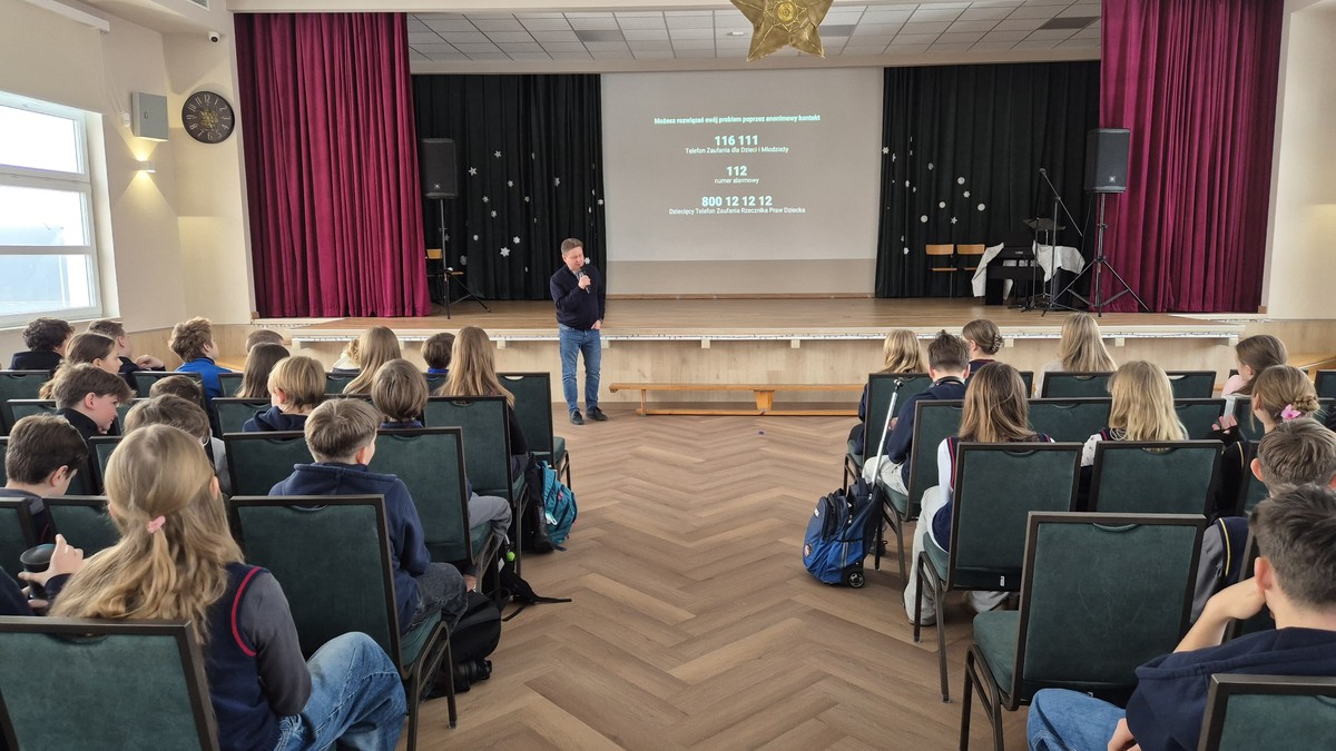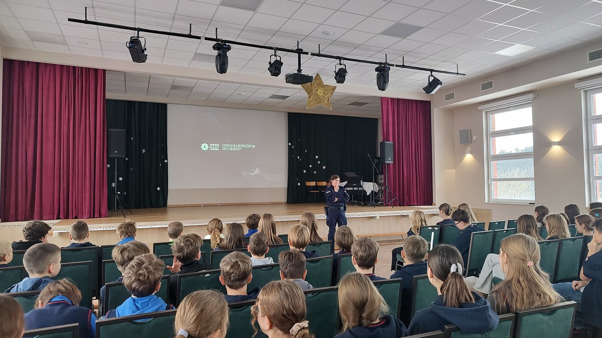 Mł. asp. Adrianna Nadarzewska oraz Michał Kuklewski zachęcali młodzież do reagowania na przejawy przemocy, zgłaszania niepokojących sytuacji dorosłym oraz korzystania z dostępnych form pomocy. Spotkanie miało również charakter otwartej rozmowy - uczestnicy chętnie zdawali pytania i dzielili się swoimi spostrzeżeniami.