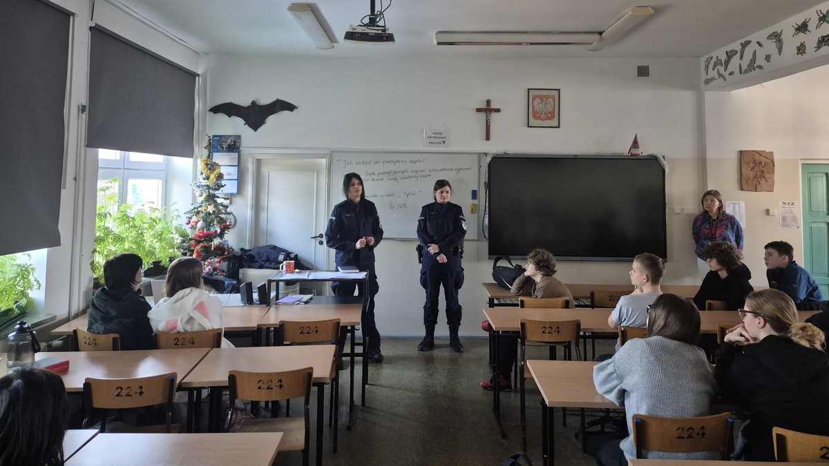 Podczas spotkania omówiono, czym jest hejt, jakie może przybierać formy oraz jakie niesie konsekwencje prawne i psychiczne wobec rówieśników. Policjantki zwróciły szczególną uwagę na problem cyberprzemocy oraz odpowiedzialność za zachowania podejmowane w sieci. Uczniowie aktywnie uczestniczyli w rozmowie, dzieląc się swoimi spostrzeżeniami i zadając pytania. Podkreślono również, jak ważna jest reakcja świadków przemocy oraz gdzie można szukać pomocy w sytuacjach zagrożenia.