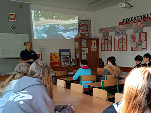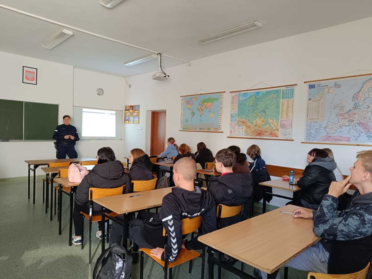 Podkomisarz Agnieszka Bubień i młodsza aspirant Adrianna Nadarzewska omówiły różne formy przemocy rówieśniczej i zwróciły uwagę na to, że agresja może powodować długotrwałe skutki emocjonalne. Policjantki podkreśliły, jak ważne jest reagowanie na pierwsze sygnały niepokojących zachowań zarówno przez uczniów, jak i dorosłych. Wskazały także, że obojętność wzmacnia poczucie bezkarności sprawców. Funkcjonariuszki przypomniały, że szkoła powinna być miejsce wolnym od zagrożeń, w którym każdy uczeń ma prawo czuć się szanowany i chroniony.